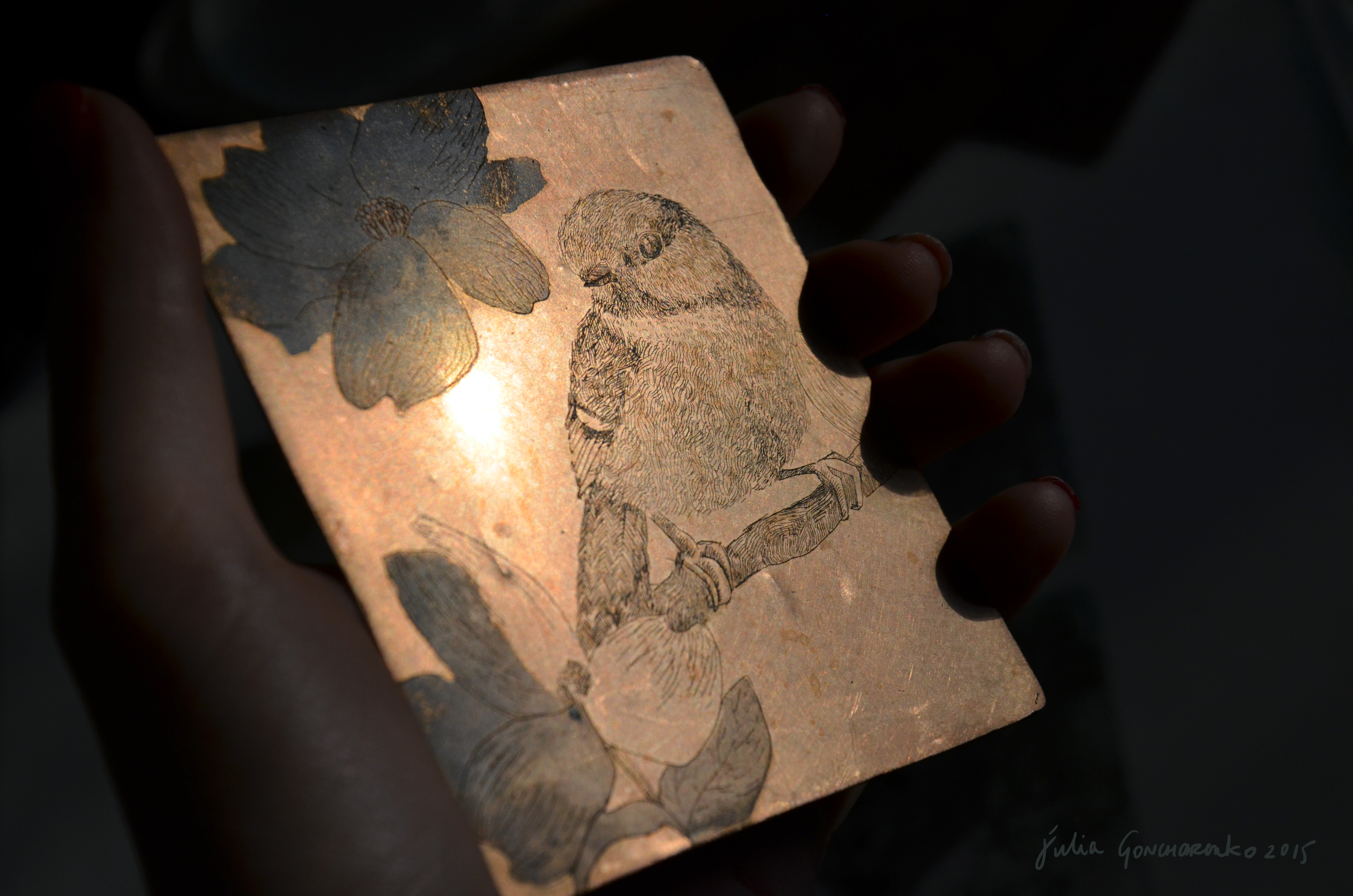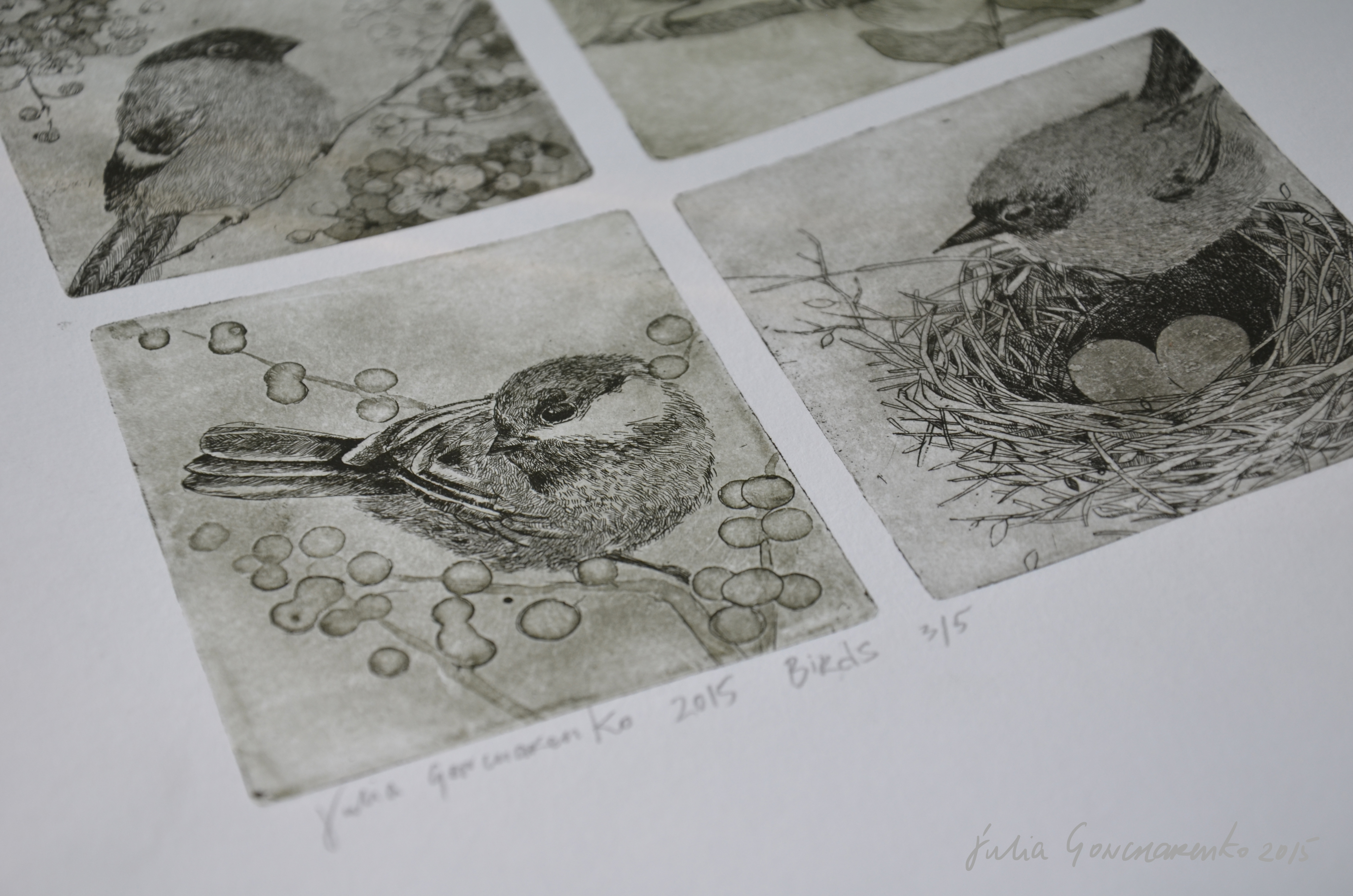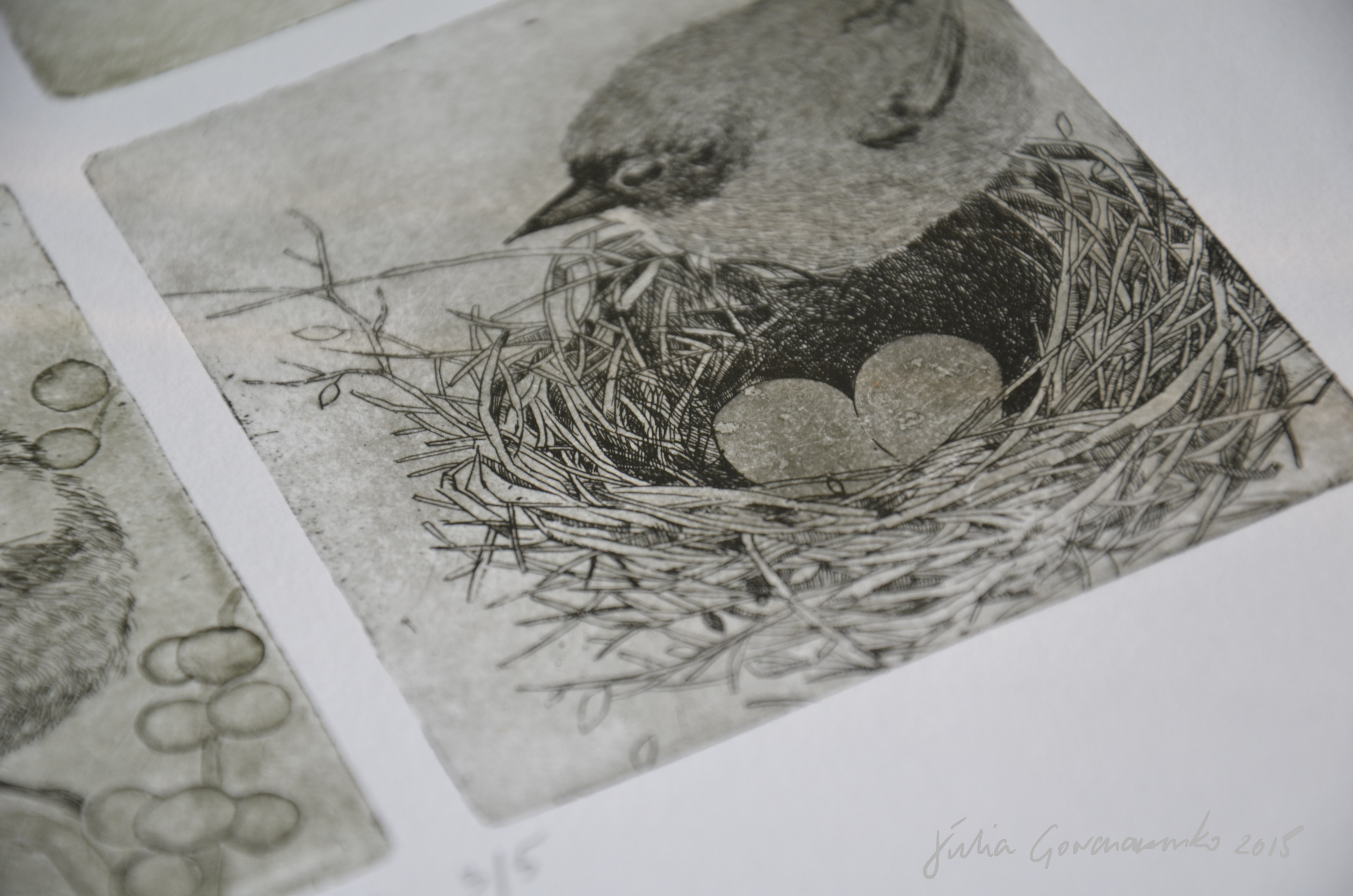 I like this style of working because it gives possibilities to draw very small lines and plumage becomes more realistic and subtly. On my opinion texture that gives aquatint on flowers and eggs make it more daintily.