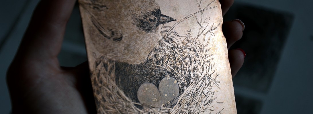 I like this style of working because it gives possibilities to draw very small lines and plumage becomes more realistic and subtly. On my opinion texture that gives aquatint on flowers and eggs make it more daintily.
